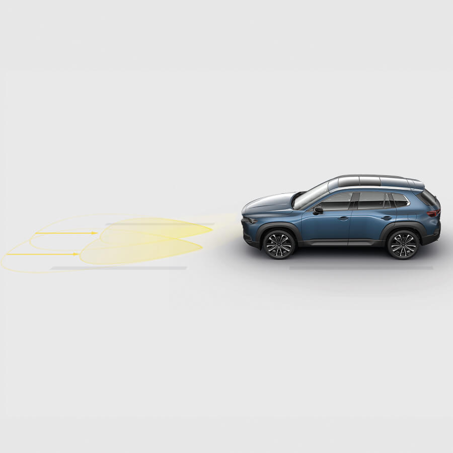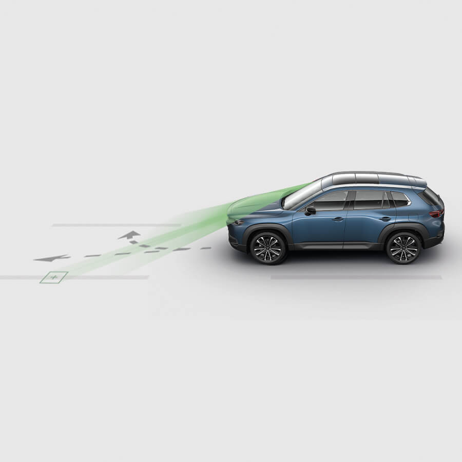 La Cámara Sensora Frontal (FSC) monitorea y detecta la posición de tu Mazda CX-50 respecto a las líneas de la vía y te advierte con una alarma sonora y vibración en el volante, en caso de que pierdas involuntariamente la trayectoria del carril. También está la posibilidad de realizar una sutil corrección, si no tomas acción. Este sistema opera a velocidades de 60 km/h o más.